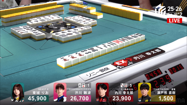 待ちの追いかけリーチをかける。アガリは出ず、内川と瀬戸熊の2人テンパイで流局した。