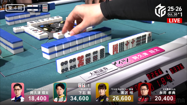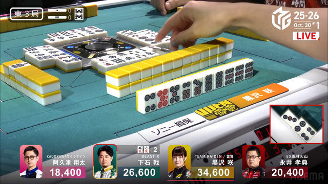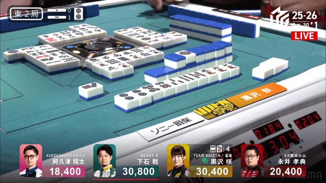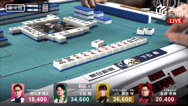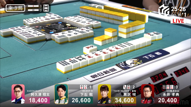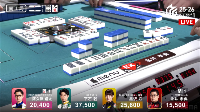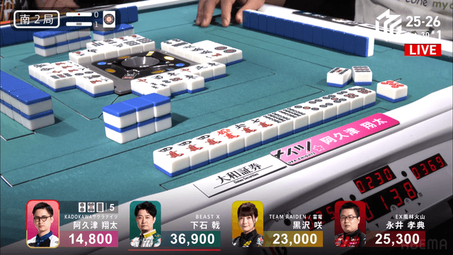 東2局1本場 下石と阿久津のイーシャンテンが長引き、その間隙を縫って黒沢が