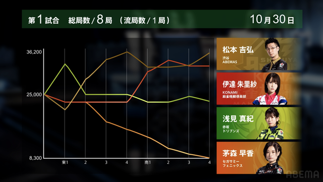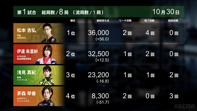 東場の3連続のアガリで点棒を稼ぎ、南場の伊達の猛追を躱しきった松本が接戦からトップを持ち帰った。