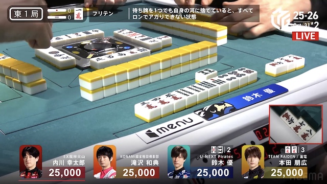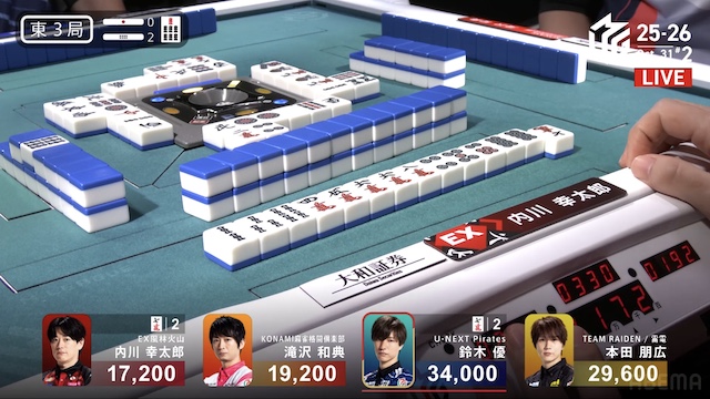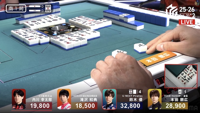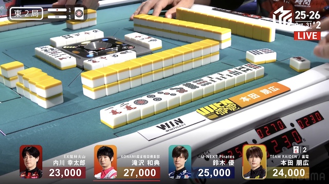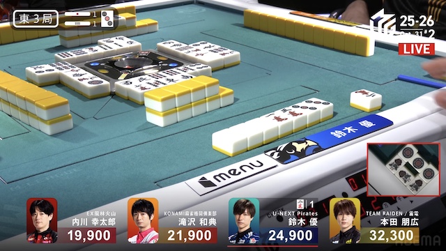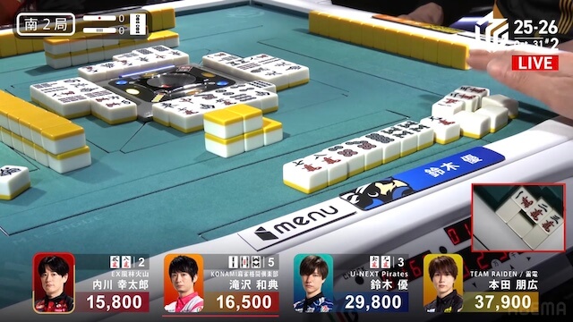 南3局1本場、2着目の本田が6巡目に先制リーチ。4着目の内川が回りながら追いつき、テンパイを入れてめくり合いに。内川は本田への放銃牌となる