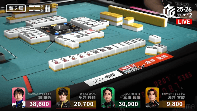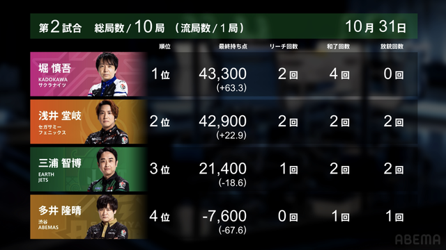 南4局、トップ目の堂岐まで12600点差の堀が、多井から12000のロンアガリ。三浦が出したリーチ棒を加えて、400点差で逆転し終局となった。