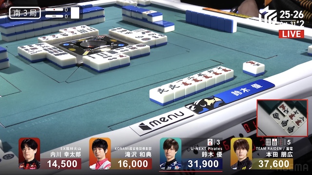 南2局、内川・滝沢・優の三軒テンパイによるめくり合いは、優が競り勝ってツモアガリ。300・500を手にして、トップ目の本田まで5700点差に迫る。