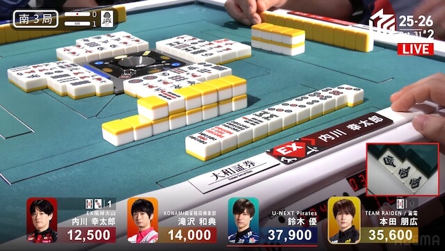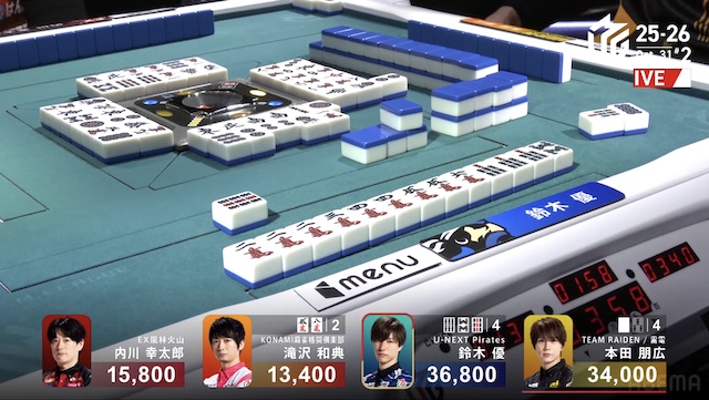待ちで先制リーチをかける。しかし、優のツモ番が来る前に、内川がツモアガリ。500・1000を手にして3着目に浮上した。