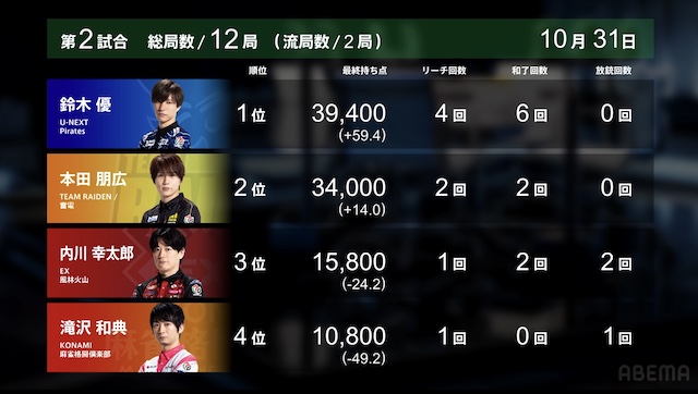 南4局、2着目で親の本田がテンパイを入れている中、トップ目の優が先制リーチ。4着目のさらに滝沢も着アップのテンパイを入れる。最後は滝沢がつかんだ