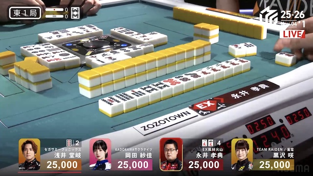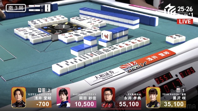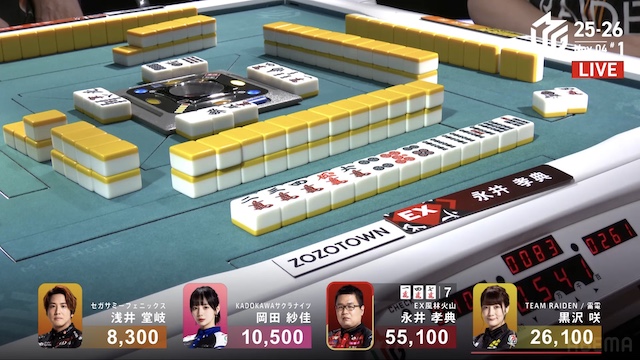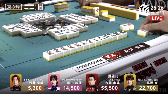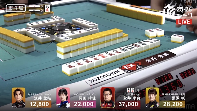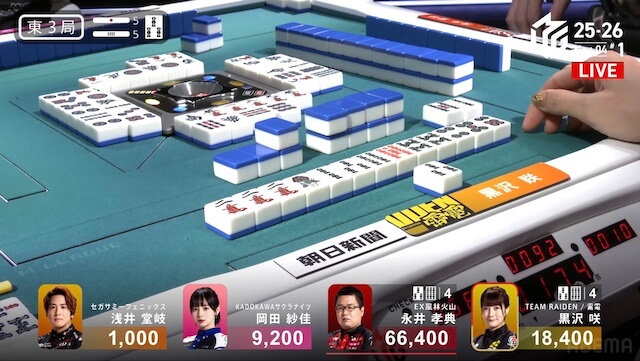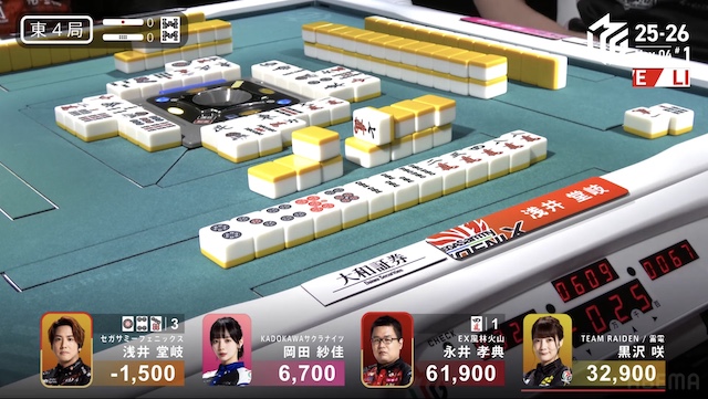 東3局4本場、供託が2本ある。親の永井が8巡目に先制リーチを打つと、ドラドラ赤赤の黒沢が9巡目に追いかけリーチで対抗する。さらに堂岐が13巡目に追いついてリーチ。三軒によるめくり合いに。しかしアガリは生まれず、三軒テンパイで流局。供託が5本になり、五千点棒に交換された。