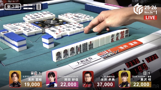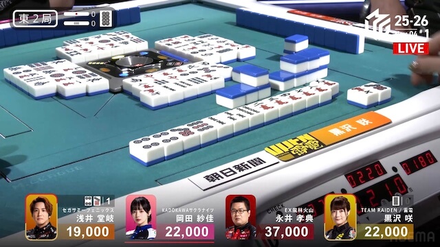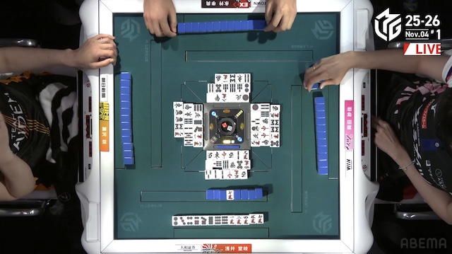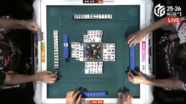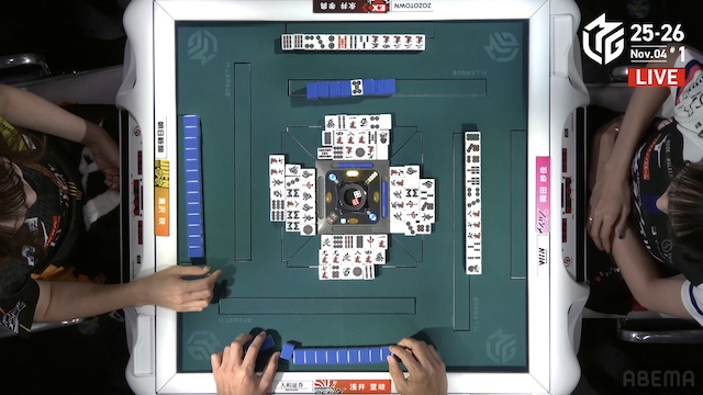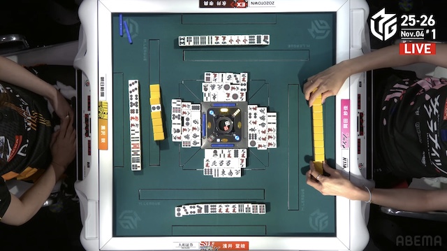 東3局3本場、永井が6巡目に先制リーチ。岡田が7巡目に追いかけリーチで対抗する。しかしアガリ牌がことごとく脇に流れ、二軒テンパイで流局した。