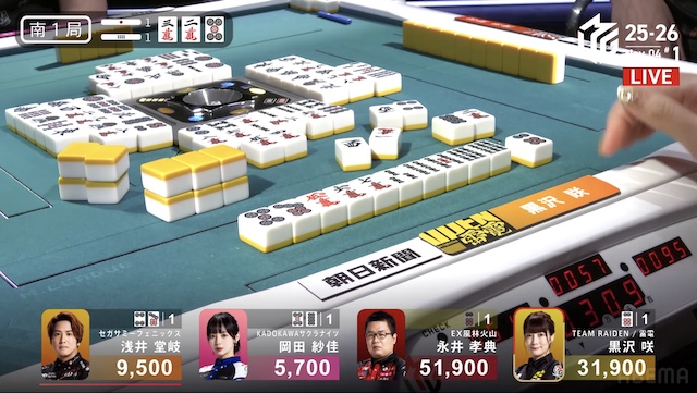 南4局、トップ目の永井が先制リーチ。黒沢から一発でロンアガリし、12000となる。しかし着順は変わらず、黒沢は2着をキープしての終局となった。