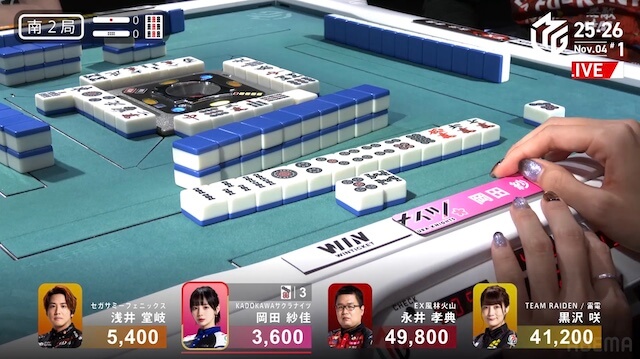 南2局1本場、トップ目の永井が10巡目に先制リーチ。親の岡田が追いついてリーチで対抗する。岡田のアガリ牌である