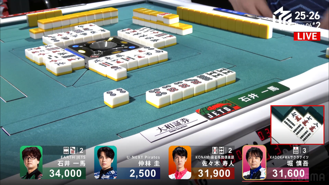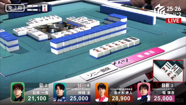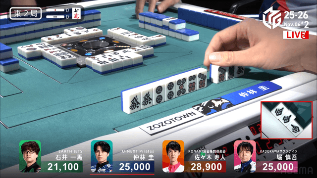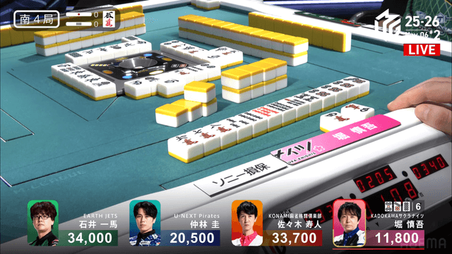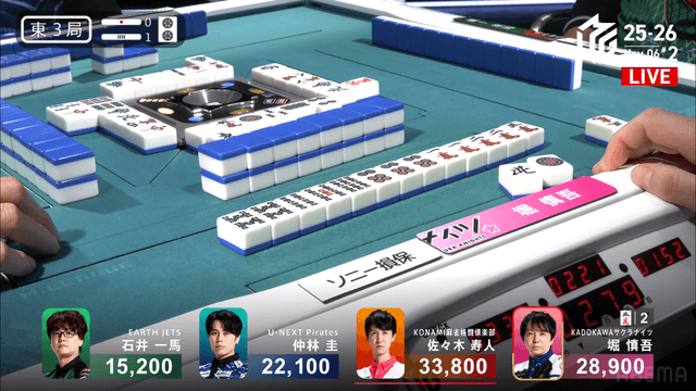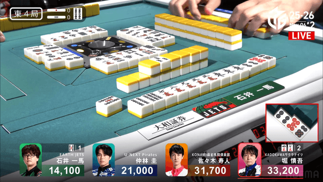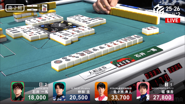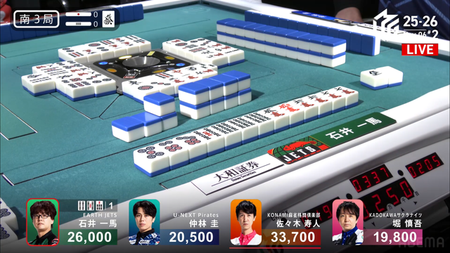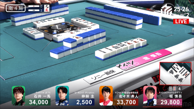 待ち、高目567三色同順を狙う。堀がテンパイをいれてドラ単騎のテンパイをいれるがテンパイ打牌が