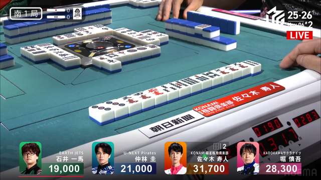 待ちの先制テンパイをいれる。ここに堀・一馬がリーチで追いつくが、テンパイをいれた仲林から