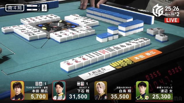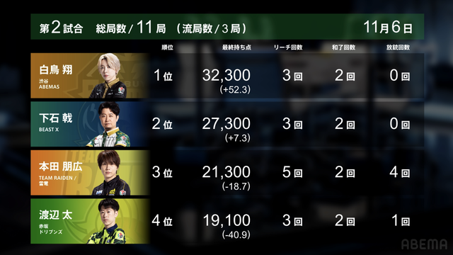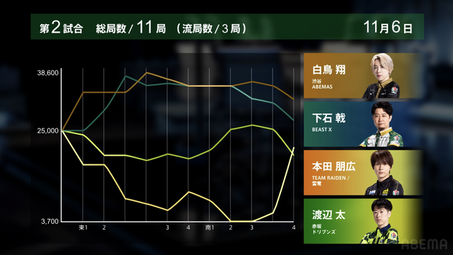 白鳥が開局から満貫のアガリを決めるが、中盤から終盤まで下石とのデッドヒートの様相を呈する。