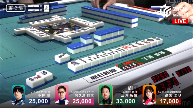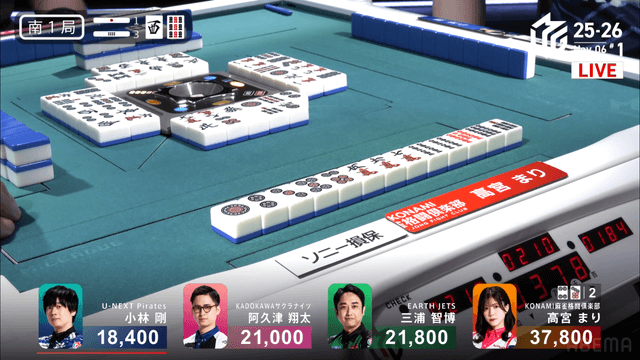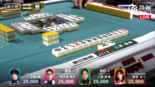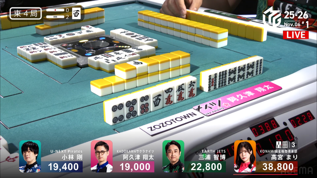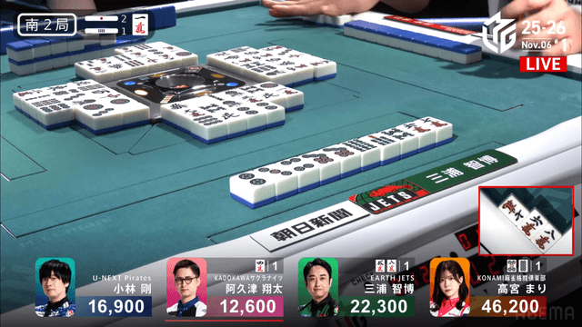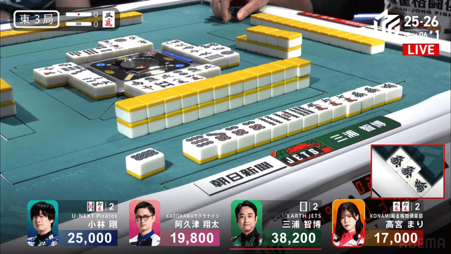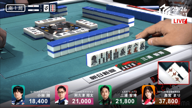 が阿久津から打ち出される。三浦が1500のアガリで連荘する。