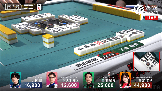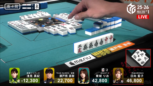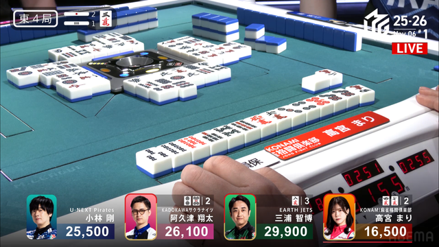 待ちで先制リーチ、満貫ツモで2着を狙う。手詰まった三浦、見えてるドラの枚数や阿久津の手役を鑑みてタンヤオに当たらない