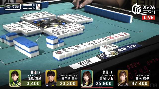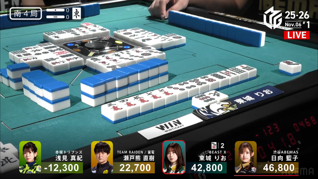 親番で跳満のアガリを決めた日向と東城が僅差のままオーラスに突入する。