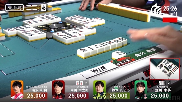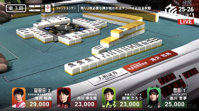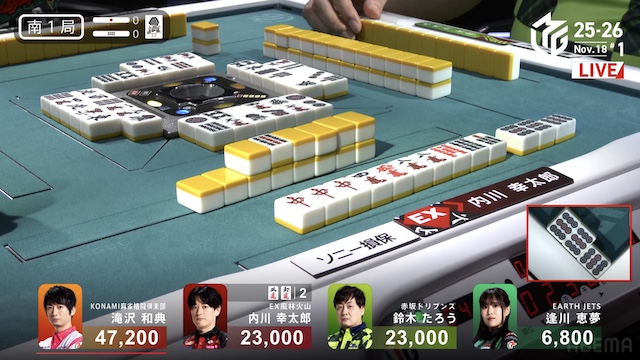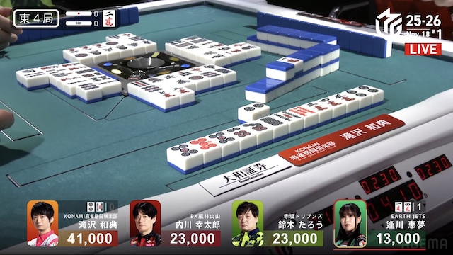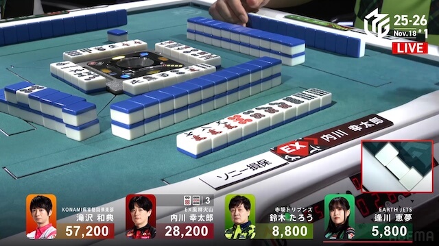 東4局、内川が門前でファーストテンパイを入れるが、役がないためツモった時のみアガれる形に。その間隙を突いて、4着目で親の逢川が先制リーチを打つ。トップ目の滝沢が門前で追いついて、ダマテンを選択。逢川がツモ切った