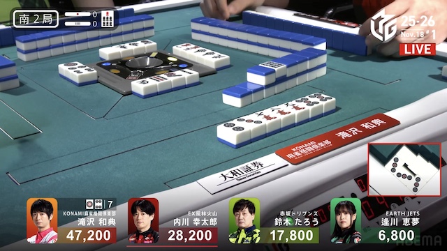 南2局、トップ目の滝沢が、2着目のライバル内川の親を落としにいく。二副露からロンアガリで、1000点を手にして1局消化した。