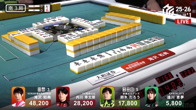 待ちで先制リーチ。トップ目の滝沢がダマテンで局消化を目論む。最後はたろうが
