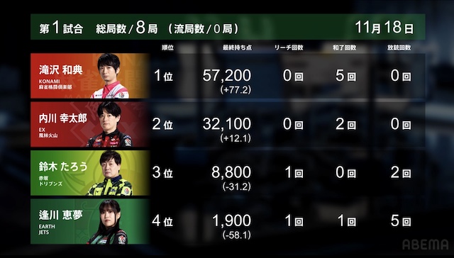 待ちでテンパイすると、逢川からロンアガリ。着順は変わらず、終局となった。