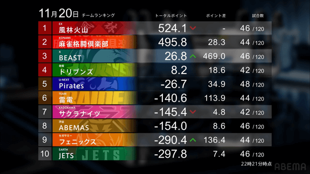 Piratesが次戦トップを取ればプラス圏内の位置まで回復、JETS、ABEMASは一歩後退となったが、下位のチームはまだまだ僅差、1週間単位で大きく順位は今後も入れ替わっていくだろう。