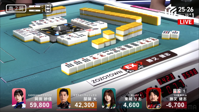 待ちで追いかけリーチをかける。醍醐が最終手番でテンパイをいれ、勝又・東城・醍醐の1人テンパイで流局した。