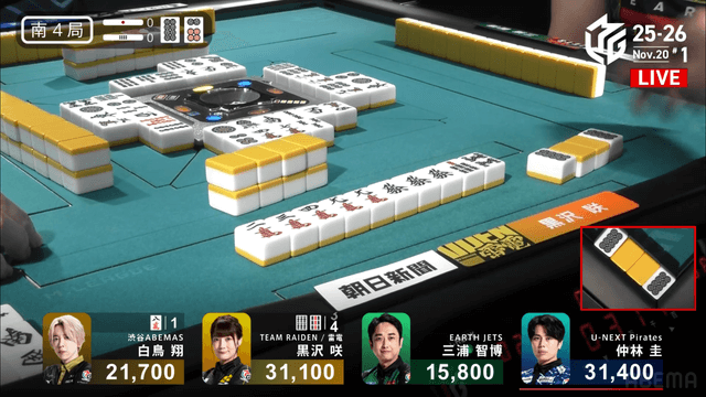 終盤までリードを維持する仲林だったが、四暗刻のテンパイが入った南3局1本場に白鳥の仕掛けに捕まり、黒沢と僅差の状態でオーラスに突入する。
