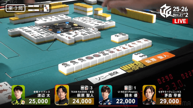 南4局、トップ目から3着目までが2万点台でひしめく中、2着目の萩原が、3着目の茅森からロンアガリ。萩原が逆転トップとなった。
