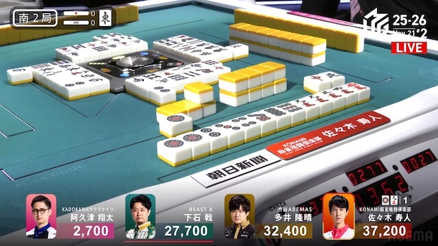 南1局、多井、寿人に加え、親の阿久津もテンパイを入れ、三軒でめくり合う。カンが2回入ってドラが3種になる中、最後は寿人がツモアガリ。2000・4000を手にしてトップ目に立つ。