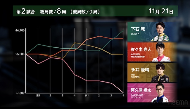 東4局、多井と阿久津がテンパイを入れてめくり合う。最後は阿久津が多井の三色同順になる高めアガリ牌をつかみ、多井がロンアガリ。12000となった。多井がトップ目に立って南入する。