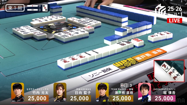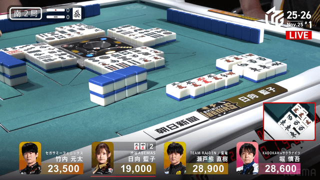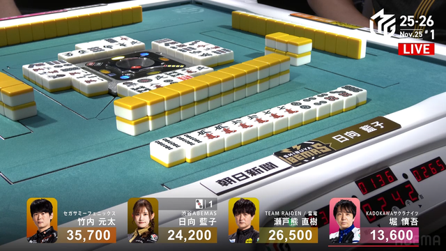 待ちで追いつく。しかし結果は堀と瀬戸熊の2人テンパイで流局。