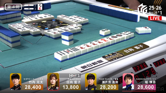 待ちで追いついてリーチ。さらに親の瀬戸熊が仕掛けて![]()