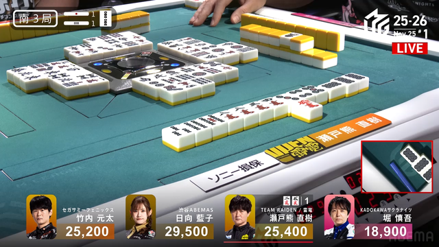 南3局1本場、終盤に親の瀬戸熊が仕掛けて![]()