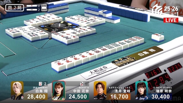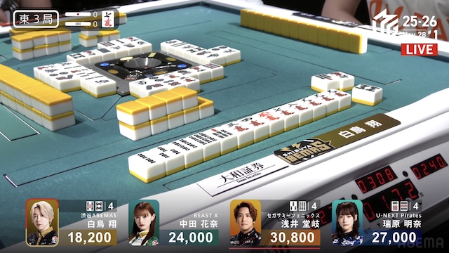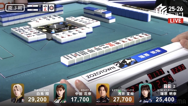 タンキでファーストテンパイ。瑞原が門前で追いつき、リーチで攻勢に出た。トップ目の白鳥を追う2番手の対決は、瑞原がツモアガリ。3000・6000でトップ目まで駆け上がった。