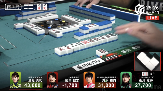 南2局、勝又が仕掛けている中、浅見がリーチをかけると、滝沢からロンアガリ。12000を手にして、逢川を逆転。