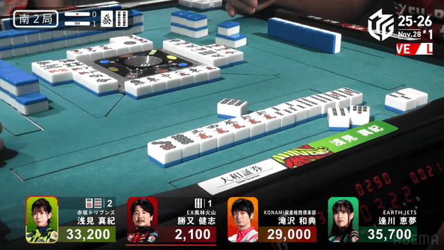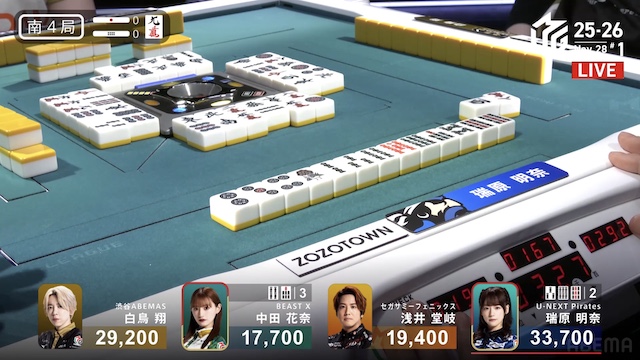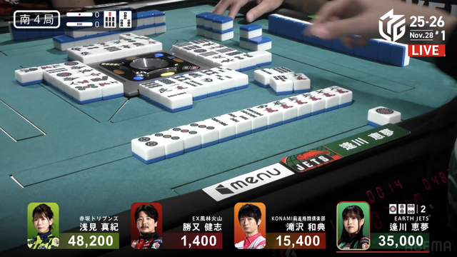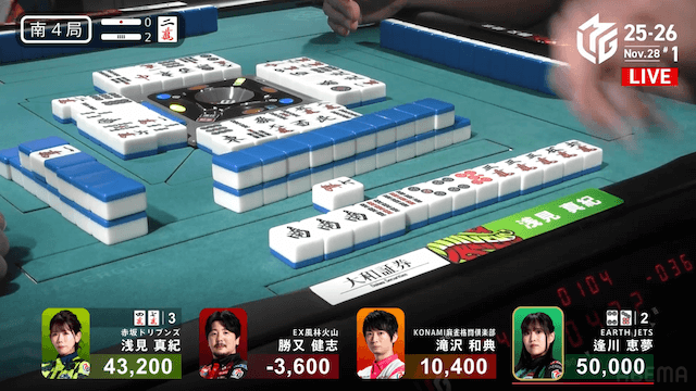南4局、親の逢川が4000オールで浅見をかわし、いったんトップ目に立つ。