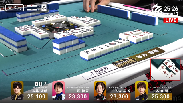 待ちでリーチ。結果は茅森と多井の2人テンパイで流局。