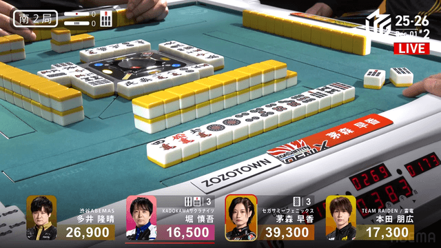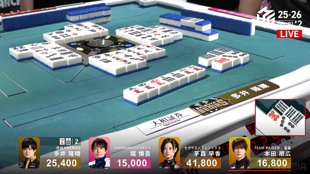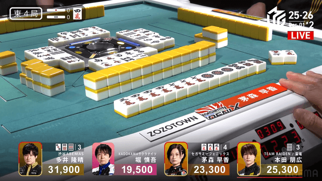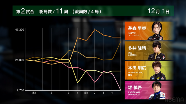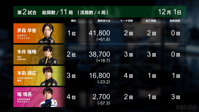 を勝負すると多井の跳満のアガリ。この試合は茅森のトップで終局。