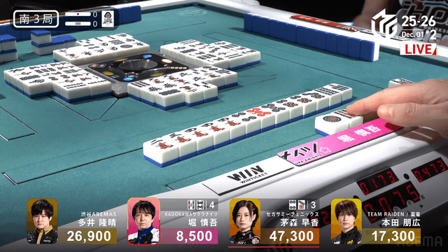 【12/1 Mリーグ2025-26 第1試合結果】至極の読みと圧倒的な手牌構想力!南3局でチャンタ・三色の鮮やかな跳満を決めた堀慎吾がオーラスの親番では他家の降りを見切ってノーテン宣言でトップを獲得!