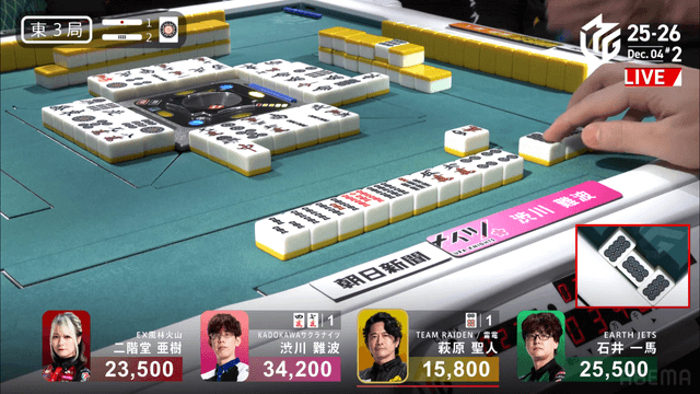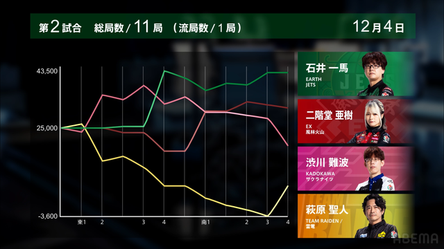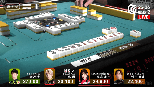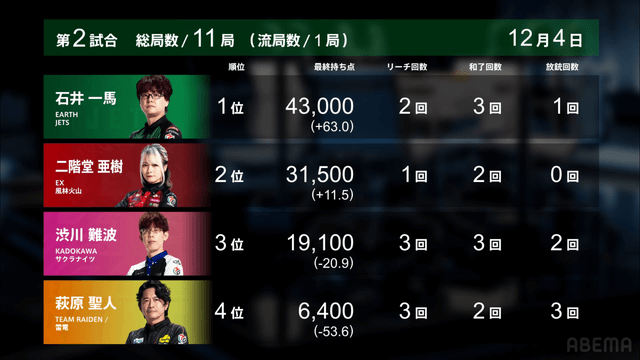 をロン、8000のアガリで箱下から脱出してゲームを終えた。このアガリにより一馬がトップを獲得した。