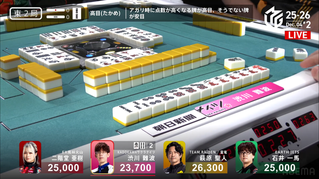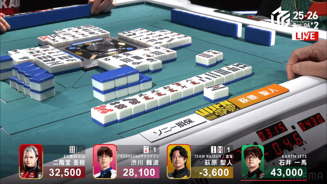 待ちのタンヤオをダマテンに構え、渋川から捕らえる。萩原が1300のアガリで開局する。