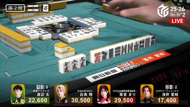 を一発ツモ、6000オールのアガリでトップ目に躍り出る。
