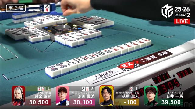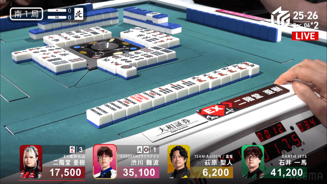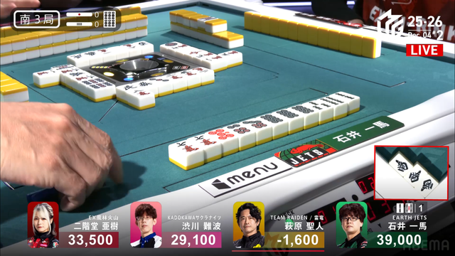 待ちで追いつき、萩原から捕らえる。一馬が2000は2300のアガリで局を進める。