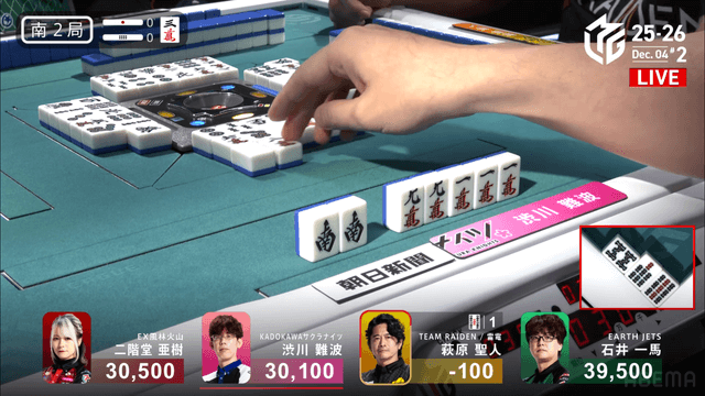 待ちで先制テンパイをいれる。これを一馬から捕らえ2000は2300のアガリ、トップとの差を縮めて南入する。