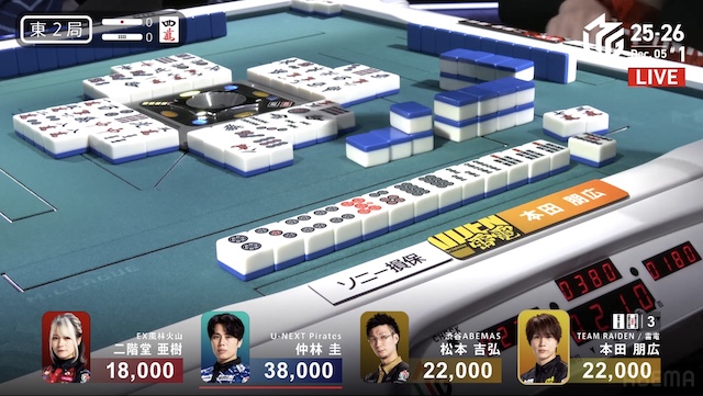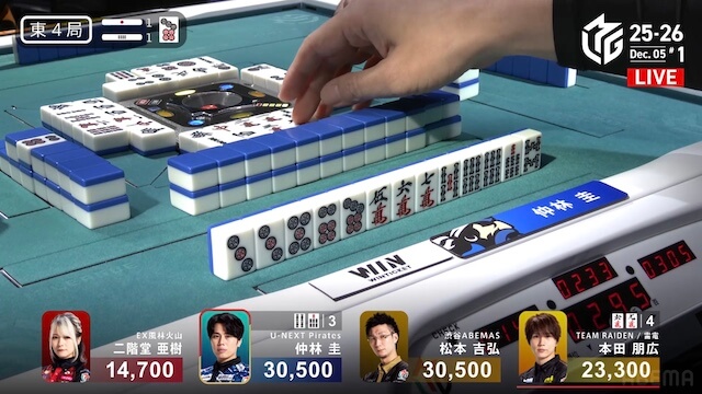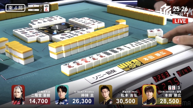 東4局、親の本田が仕掛けてファーストテンパイ。仲林が門前で追いつき、13巡目に先制リーチで勝負をかける。しかしアガリは生まれず、二軒テンパイで流局した。親の本田がテンパイだったため、東4局が1本場になる。親の本田はダブ