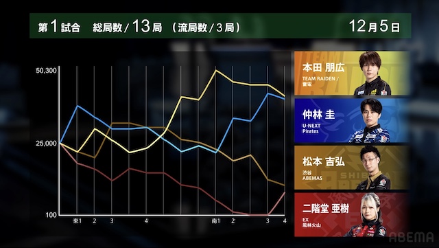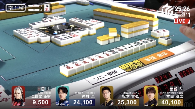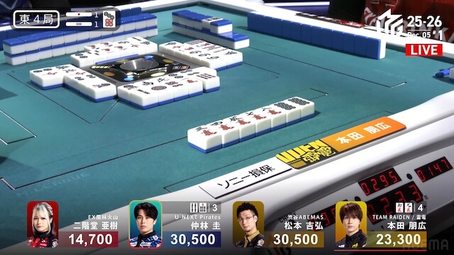東4局3本場、仲林が5巡目に先制リーチ。しかし、三者が丁寧に受けて、流局となった。続く南1局は4本場から始まり、供託が1本ある。本田が5巡目に先制リーチをかけると、親の亜樹がチーしてテンパイ。最後は本田がツモアガリ。裏ドラを1枚乗せて2000・4000とし、持ち点は5万点を超えた。