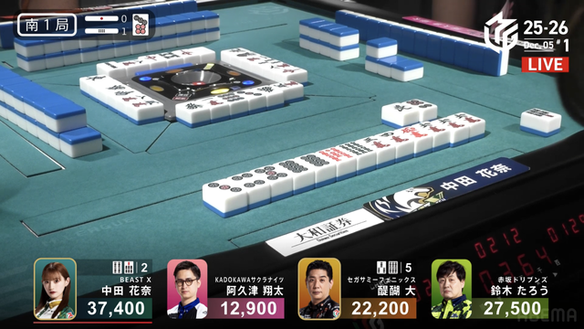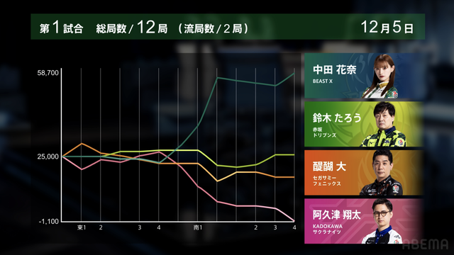 南1局1本場、中田が6000は6100オールをツモアガリ。南場に入ってからは1度もトップを譲ることなく、試合終了となった。