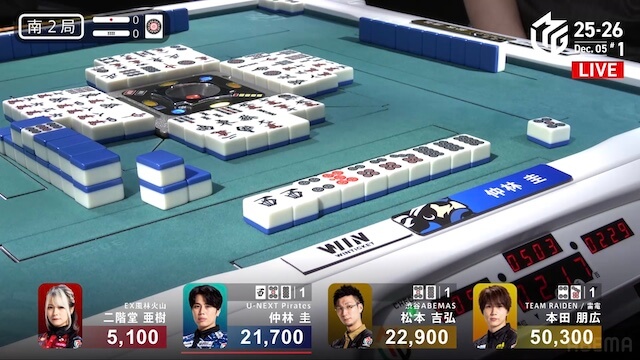 南2局1本場、3着目の松本が4巡目に先制リーチ。しかし、三者が丁寧に対応し、一軒テンパイで流局する。親の仲林がノーテンだったため、南3局が2本場から始まる。供託が1本。仲林が9巡目に先制リーチをかけると、松本のリーチ宣言牌をとらえて8000は8600のアガリ。トップ目の本田まで3000点差に迫ってオーラスへ。