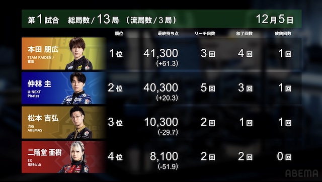 をねらう。最後は亜樹がツモアガリ。2000・4000で、本田は親被りしたものの、着順はそのままでゲームセットとなった。