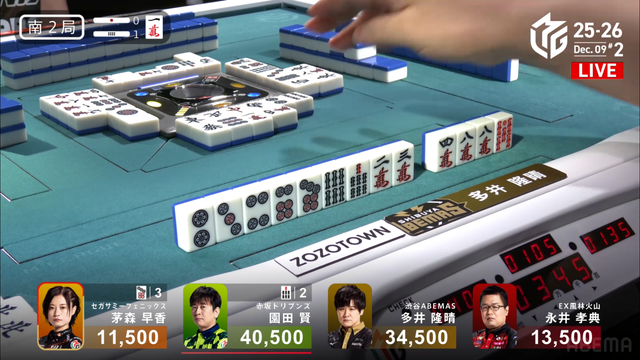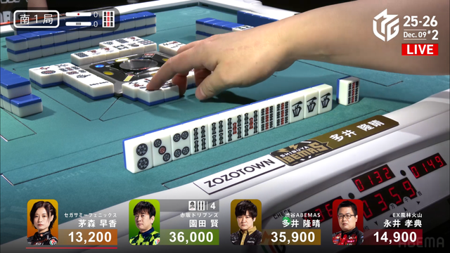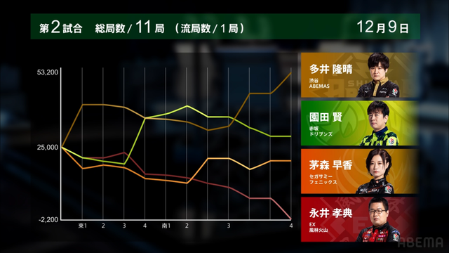 を捕らえて8000のアガリ。多井が貫禄のトップを獲得した。