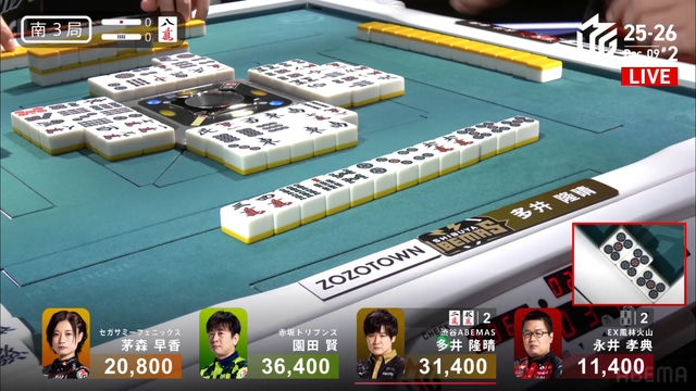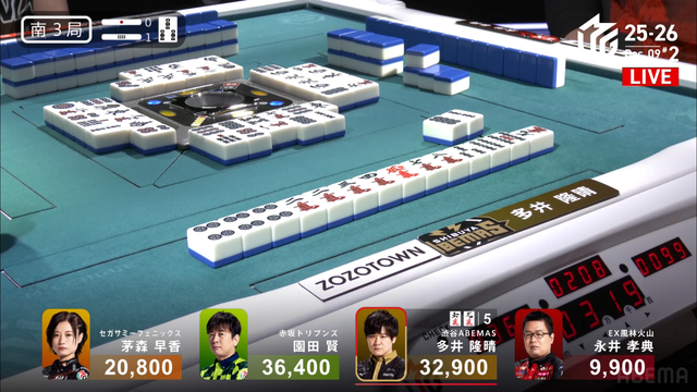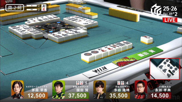 をポン、ドラを活かした満貫の仕掛けをいれる。親番多井もタンヤオ仕掛けで応戦するが、両者イーシャンテンで足踏みとなる。先にテンパイをいれたのは多井、![]()