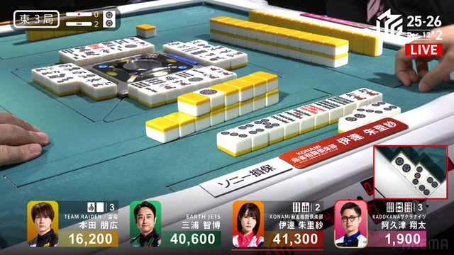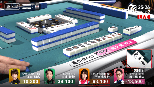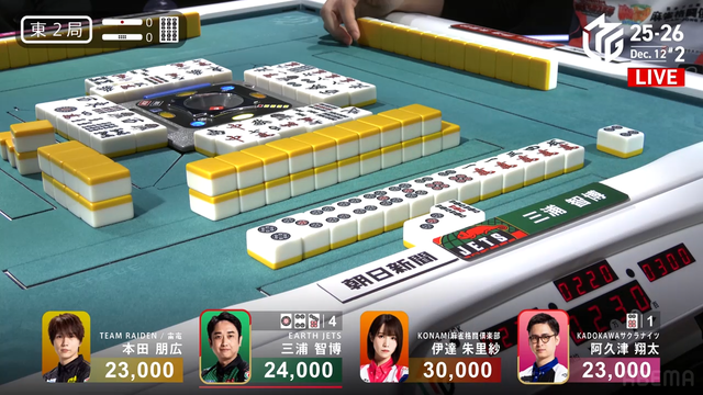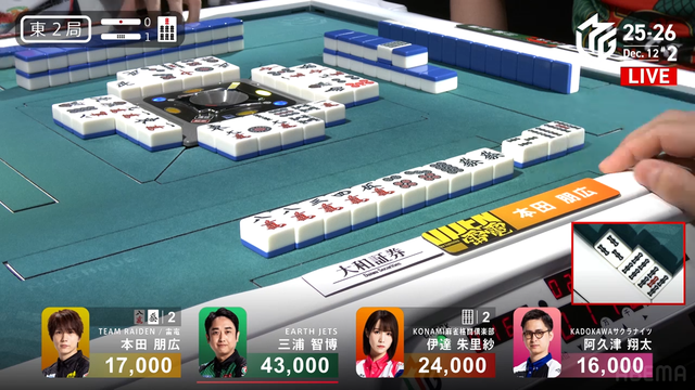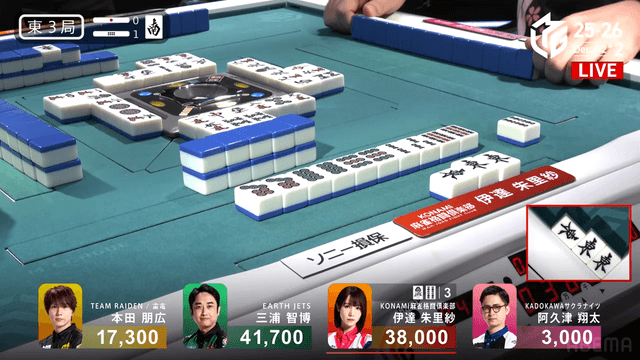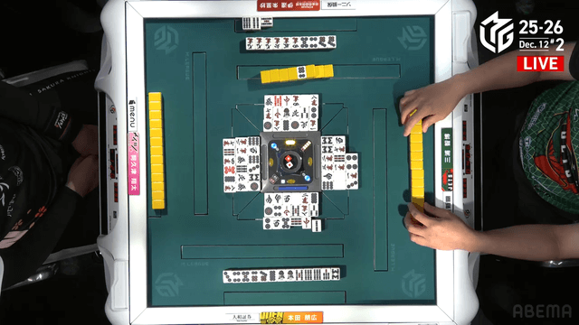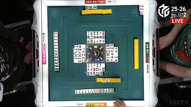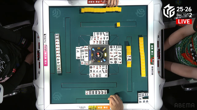 のシャンポン待ちでリーチ。2副露の本田が単騎待ちで追いつく。しかし結果は阿久津と本田の2人テンパイで流局。